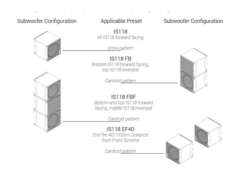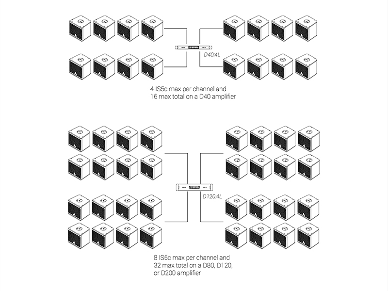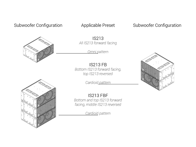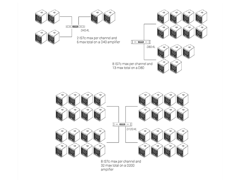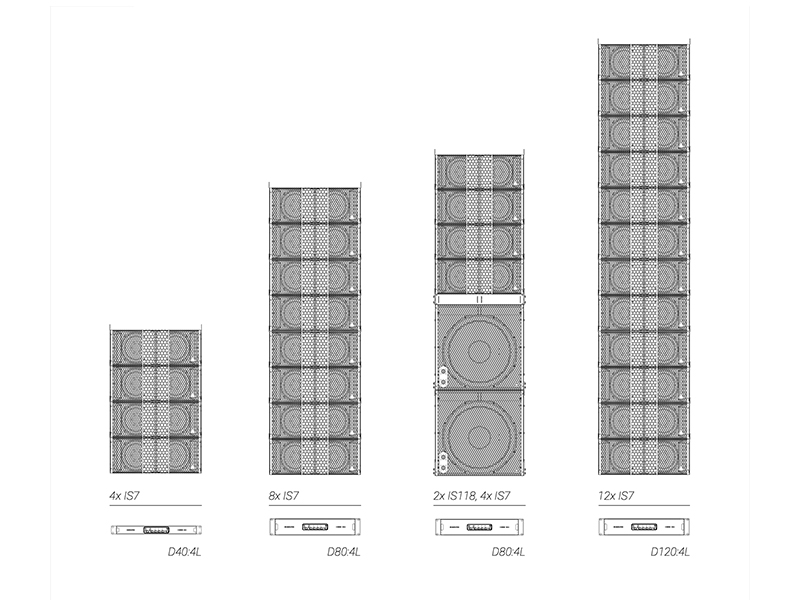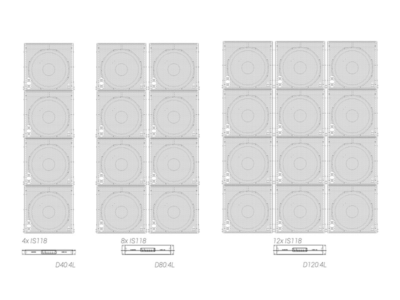 キャビネットには、マリングレードのバーチ合板に加え、航空機グレードのアルミニウムおよびスチールを採用。接続端子として、前面および背面に各1系統のSpeakon™ NL4コネクターを装備し、オプションでバリアストリップ仕様にも対応可能です。デュアルグリル構造を採用しており、カーディオイド構成時においても外観が変わらない設計となっています。統合型リギングシステムはIS7のリギングと互換性があり、シンプルなアダプターフレームを使用することで、同一アレイ内へのフライング設置が可能です。