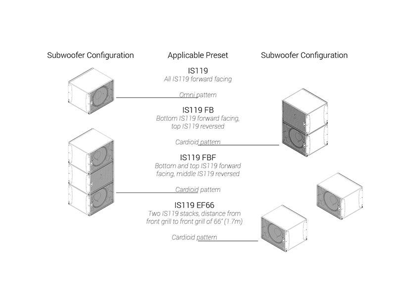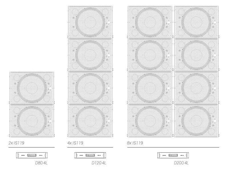 キャビネットには、マリングレードのバーチ合板に加え、航空機グレードのアルミニウムおよびスチールを採用。接続端子は、IS119には前面および背面に各1系統のSpeakon™ NL4コネクターを装備し、IS119bではバリアストリップ仕様となります。デュアルグリル構造を採用しており、カーディオイド構成時においても外観が変わらない設計です。統合型リギングシステムはIS10のリギングと互換性があり、IS10 & IS119 Support Frame(930-0028)を使用することで、同一アレイ内へのフライング設置が可能です。